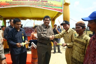 Wabup Siak menyerahkan secara simbolis Traktor kepada Kades Muara Kelantan di acara panen padi perdana desa Muara Kelantan Kec.Sungai Mandau.