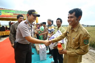Kapolsek Sungai Mandau menyerahkan secara simbolis sekotak racun hama kepada petani di acara panen padi perdana desa Muara Kelantan Kec.Sungai Mandau.