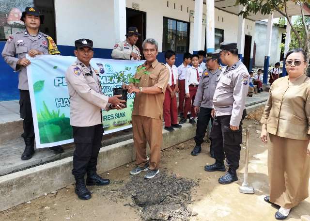 Polsek Tualang menggelar kegiatan Green Policing melalui penanaman pohon serentak di SD S Nusantara, Kampung Pinang Sebatang Timur, Kecamatan Tualang, Kabupaten Siak, Senin (17/11/2025). Kegiatan ini digelar dalam rangka memperingati Hari Pohon Nasional 2025.