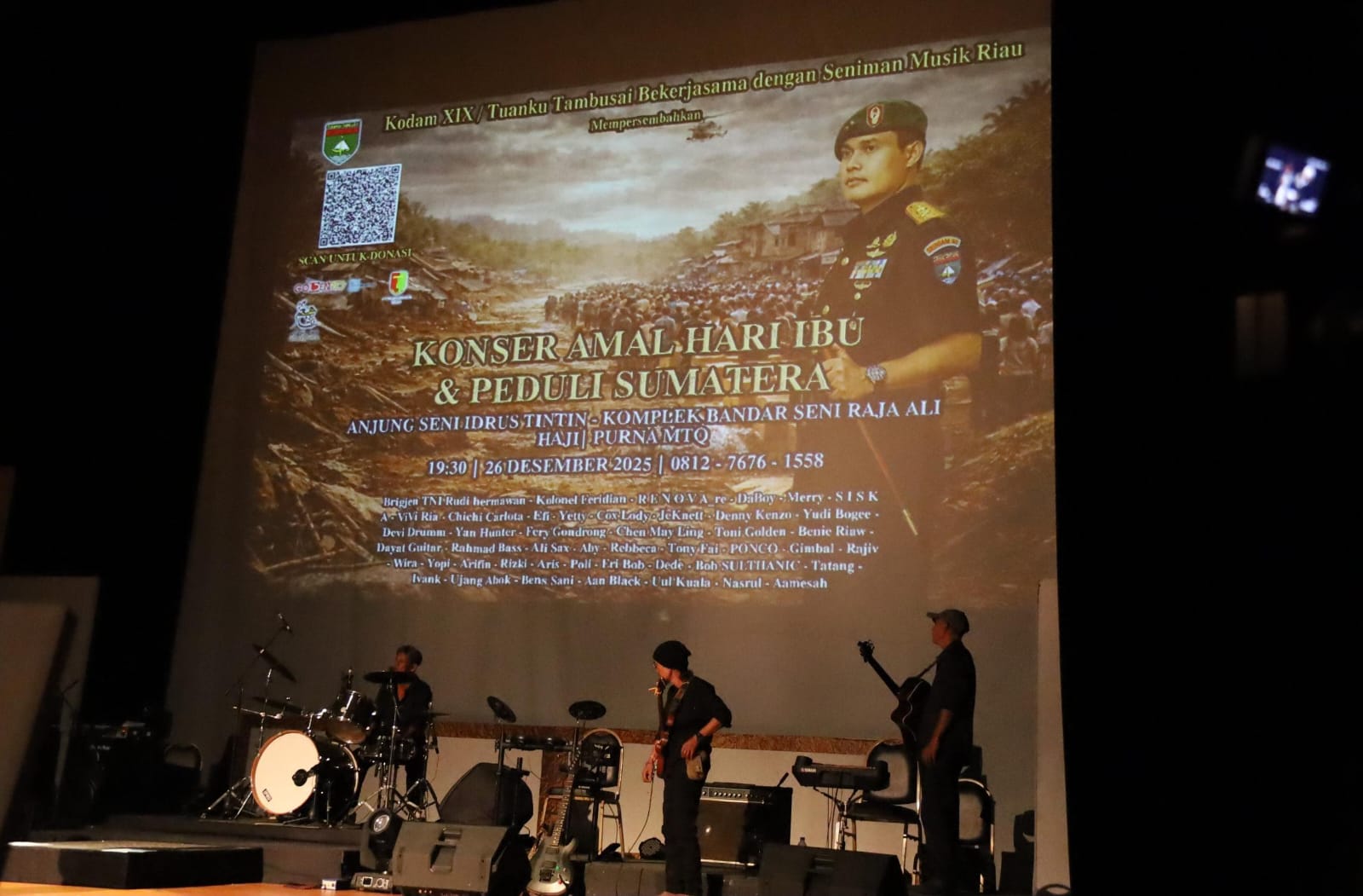 Dalam rangka memperingati Hari Ibu sekaligus sebagai wujud nyata kepedulian sosial terhadap masyarakat Sumatra, Kodam XIX/Tuanku Tambusai menggelar Konser Amal Hari Ibu & Peduli Sumatra yang berlangsung meriah, hangat, dan penuh kebersamaan di Anjungan Seni Idrus Tintin, Bandar Serai Purna MTQ, Jalan Jenderal Sudirman, Kota Pekanbaru, Jumat Malam (27/12/2025).