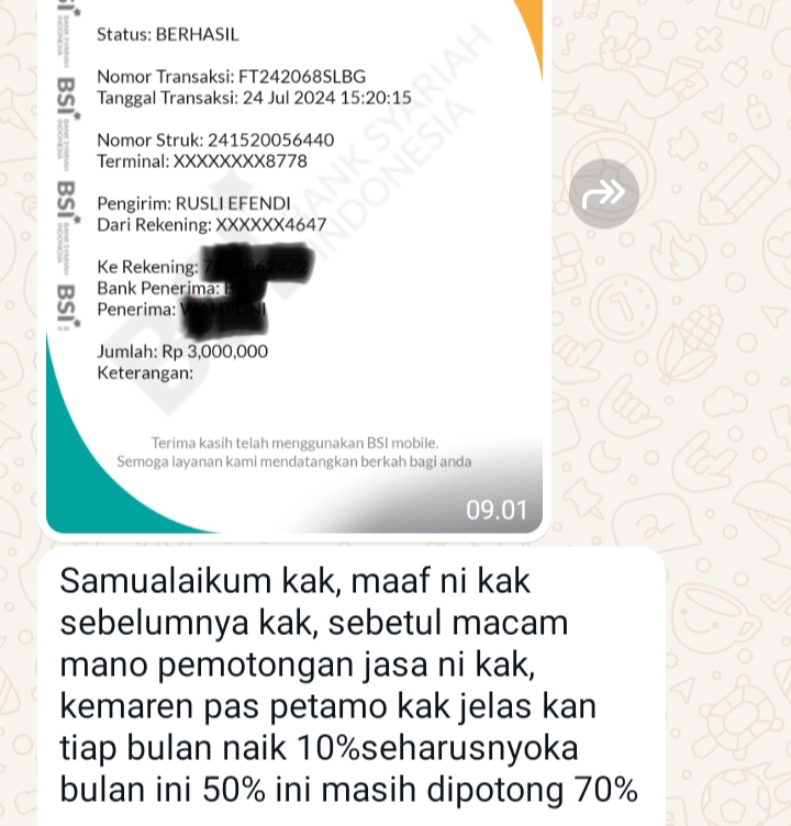 Karena merasa terlalu banyak di rugikan, Rusli protes ke Bendahara Karu sebab penyetoran pada bulan selanjutnya tetap 70% , dan di jelaskan nya bahwa, jasa yang diterima ke rekening Rusli senilai Rp.4.095.000 di potong 70% dan potongan jasa tersebut di setor ke rekening bendahara Karu atas nama Wahyuni sebesar Rp.2.490.000 itu pada bulan Juni 2024.