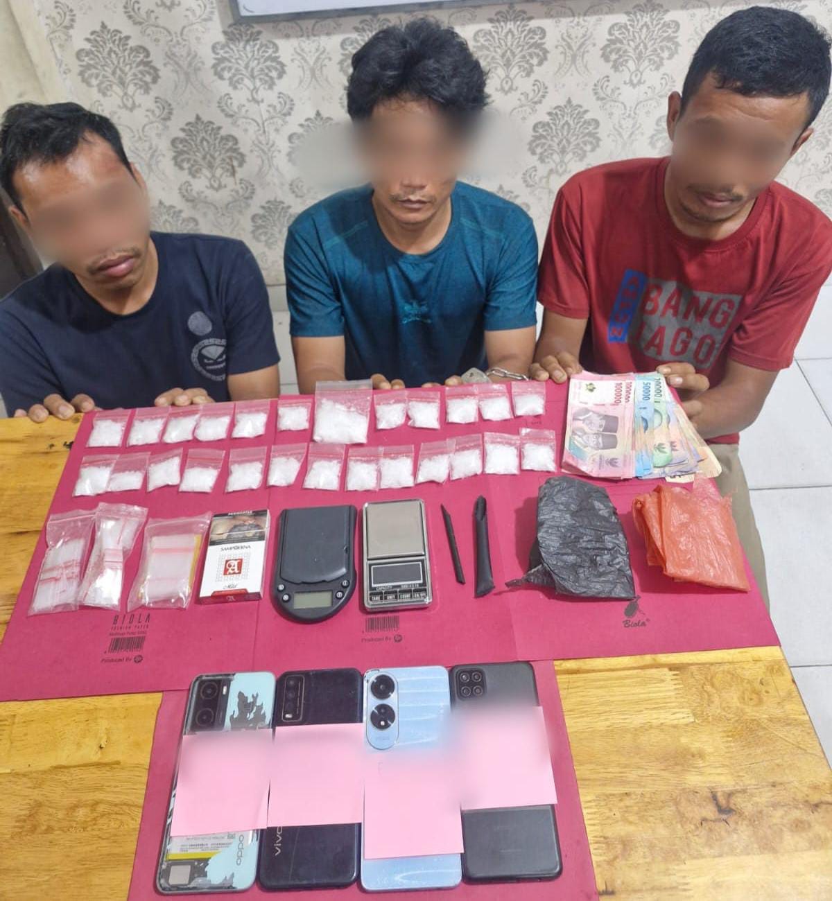 Sekira pukul 17.00 WIB, petugas berhasil mengamankan dua orang tersangka berinisial A.S.S (29) dan A.R.N (28) di sebuah rumah kontrakan di Jalan Sudirman, Telaga Sam-Sam. Saat dilakukan penggeledahan, ditemukan satu paket sabu yang disimpan dalam kotak rokok di saku celana pelaku A.S.S.