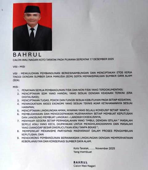 Bahrul siap maju dan siap menang dalam Pemilihan Wali Nagari Serentak pada 17 Desember 2025. Dengan pengalaman, tekad, dan pemahaman mendalam terhadap kondisi nagari, Bahrul menegaskan bahwa dirinya datang bukan untuk janji, tetapi untuk bekerja.