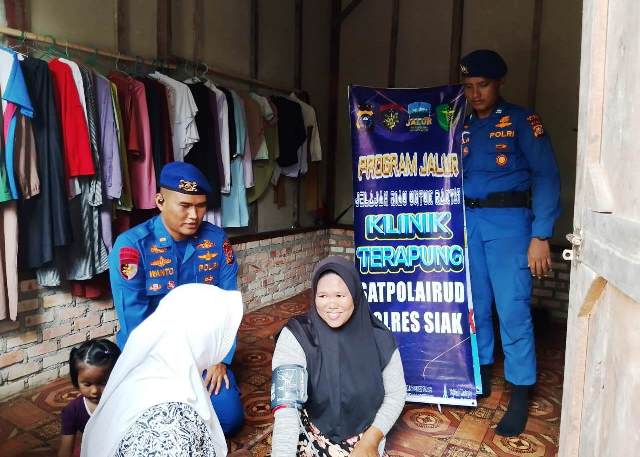 SATPOLAIRUD POLRES SIAK GELAR PROGRAM JALUR DI PESISIR SUNGAI LIMAU: BAGIKAN SEMBAKO DAN LAYANI KLINIK TERAPUNG
