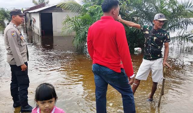 BANJIR RENDAM PULUHAN RUMAH DI MUARA KELANTAN, POLSEK SUNGAI MANDAU TURUN LANGSUNG BANTU WARGA